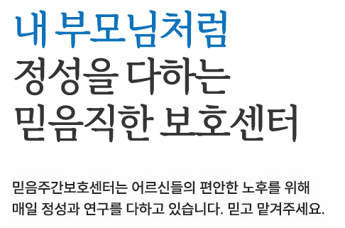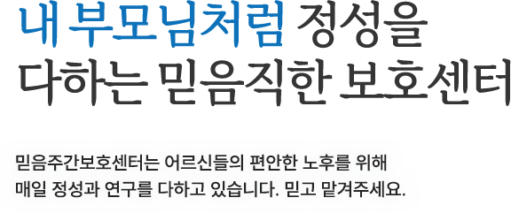 믿음주간보호센터는 어르신들의 따뜻하고 안전한 일상을 지원하는 주간 돌봄 전문기관입니다.